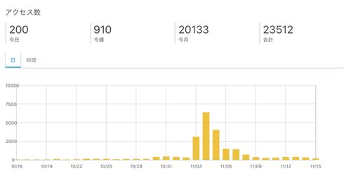 昨日の10月の報告で、1ヶ月で3000アクセス突破やったぜ的なことを書いたのですが… 11月3日のアクセス数がとんでもないことになっていました… な…なんじゃこりゃぁぁぁ!